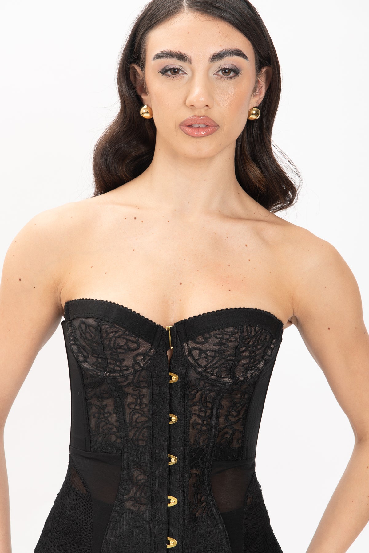 Del corpetto indossa taglia S, trasparenza sul davanti e sul retro tra il busto e il e il bacino con ricami, chiusura con gancetti sul davanti e laccio sul retro,non ha coppe interne ma contiene il ferretto, leggermente elasticizzato.