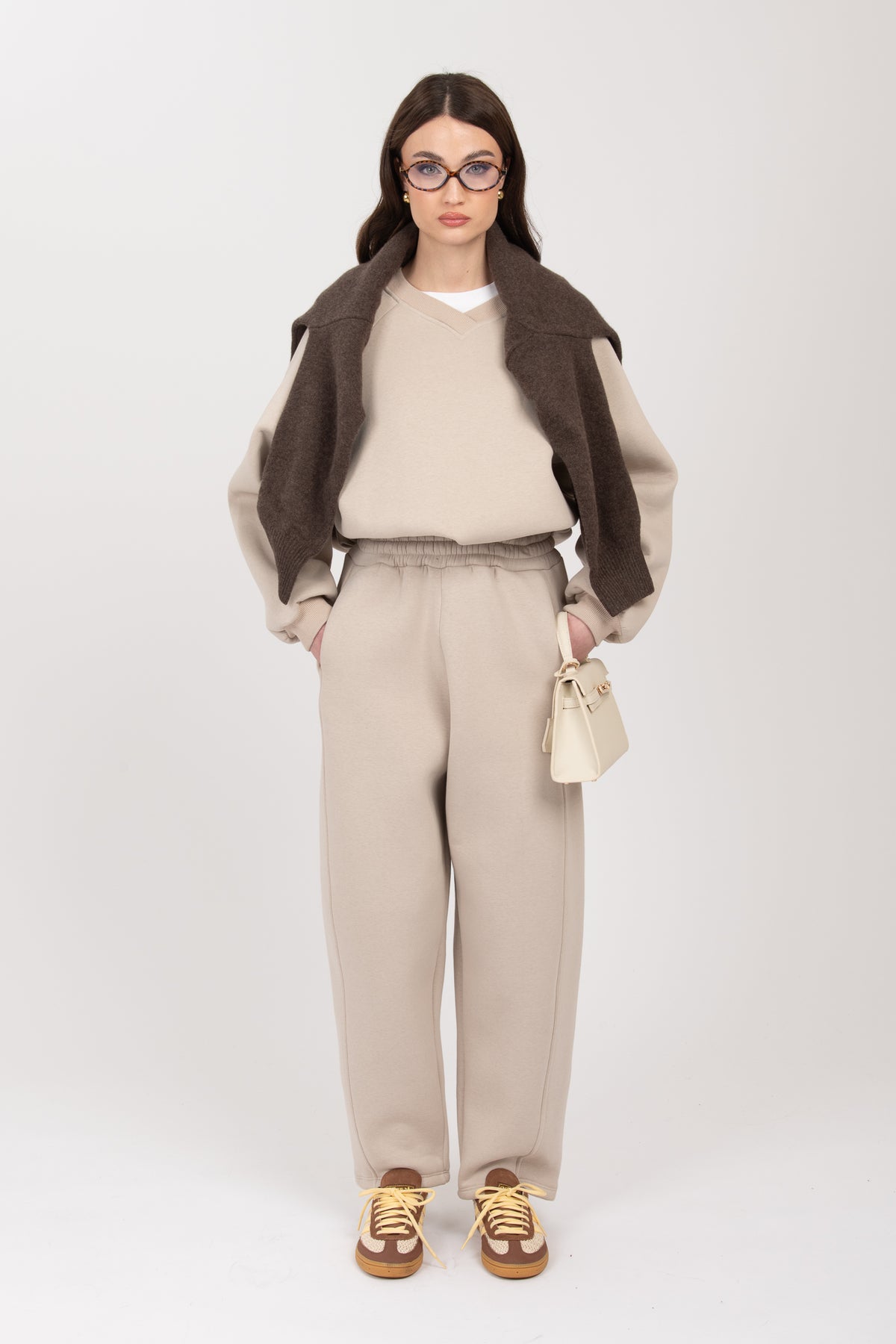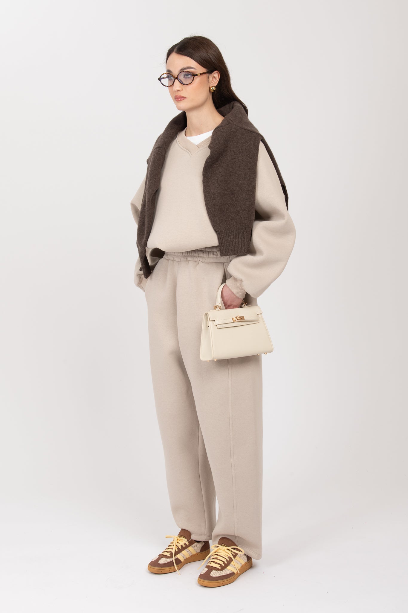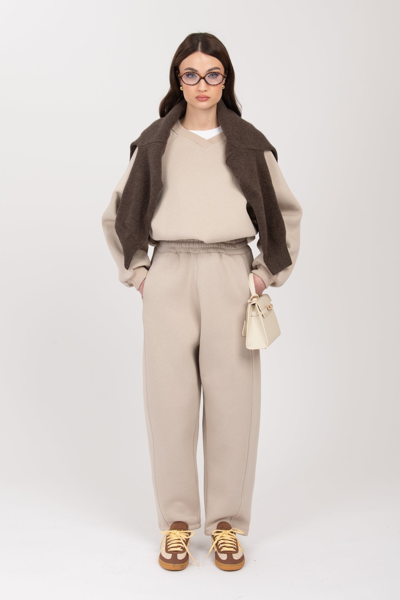 il coordinato è taglia unica ed è composto da felpa leggermente crop con elastico sul fondo , il pantalone ha l’elastico in vita tasche laterali vere consigliato fino ad altezza 1.70. Il coordinato ha il pile interno.