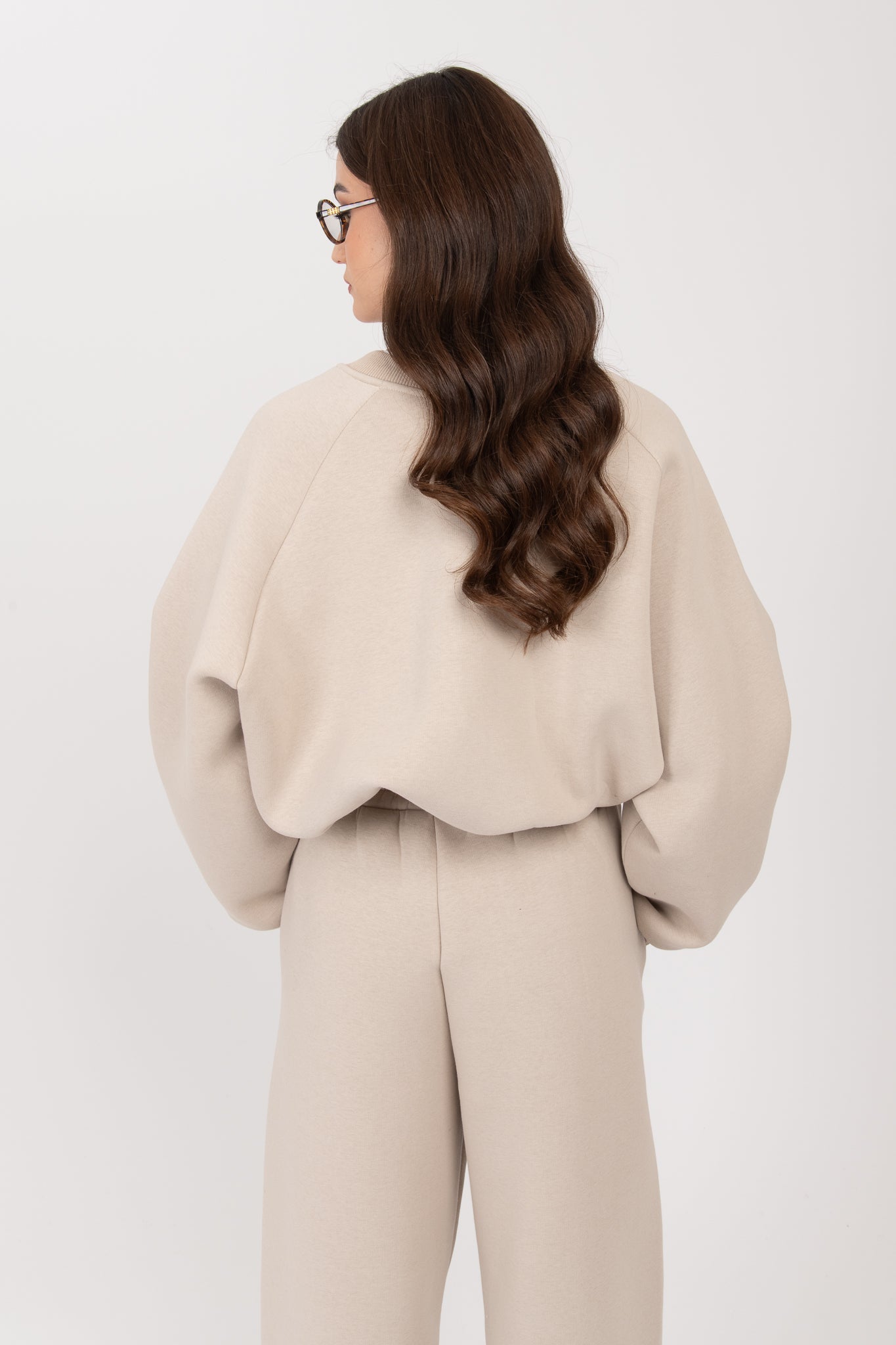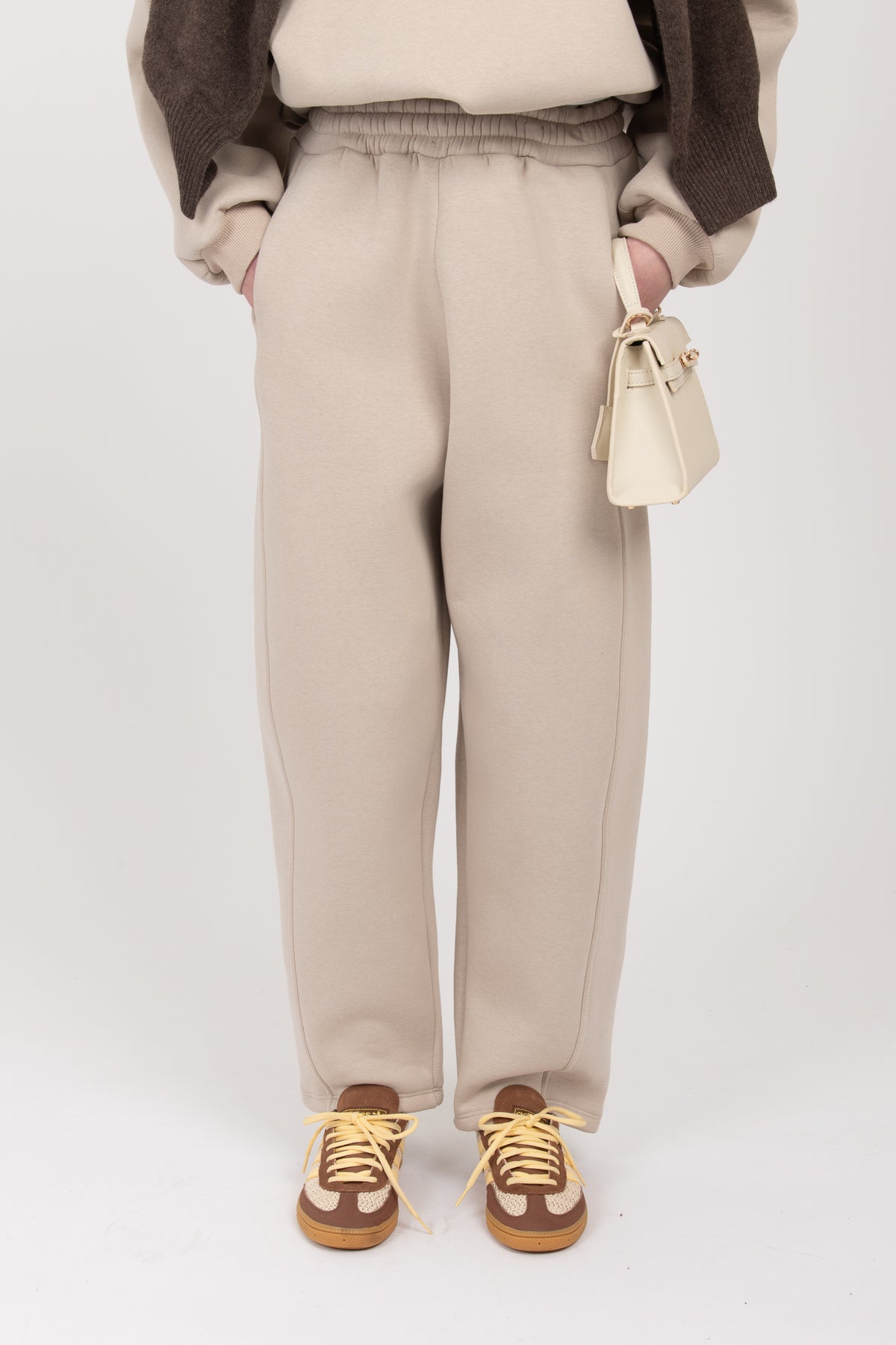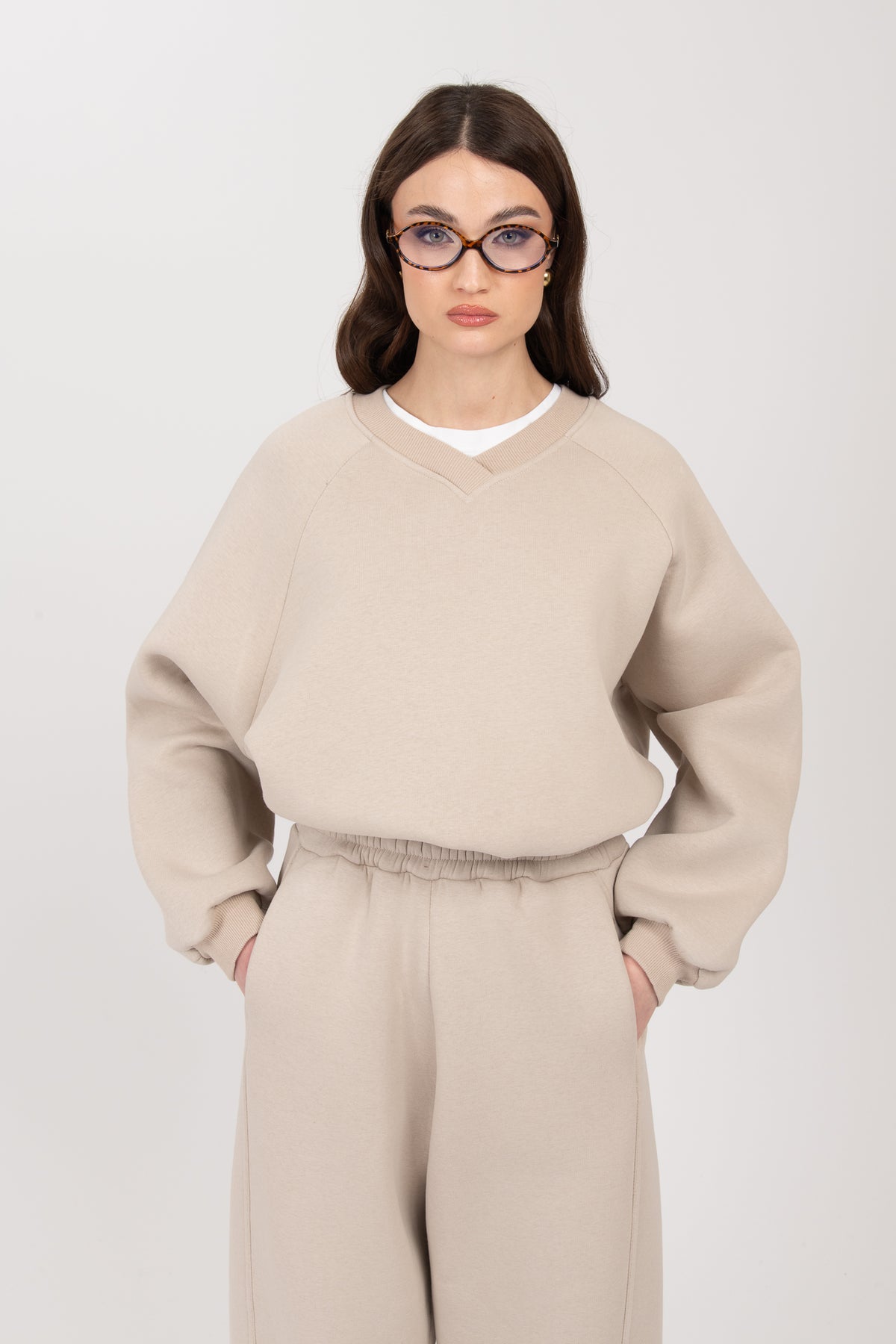 il coordinato è taglia unica ed è composto da felpa leggermente crop con elastico sul fondo , il pantalone ha l’elastico in vita tasche laterali vere consigliato fino ad altezza 1.70. Il coordinato ha il pile interno.