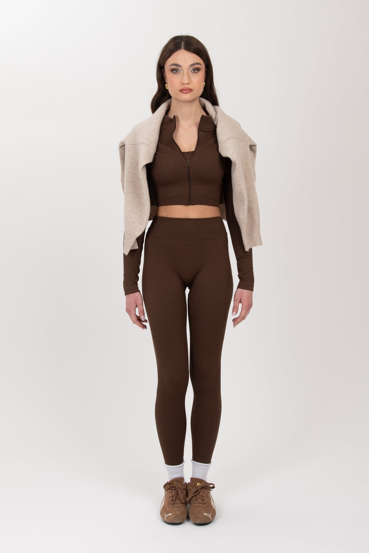 Coordinato sportivo composto da top crop elasticizzato con coppe interne, leggings vita alta elasticizzato e cardigan con zip effetto avvisato leggermente crop.