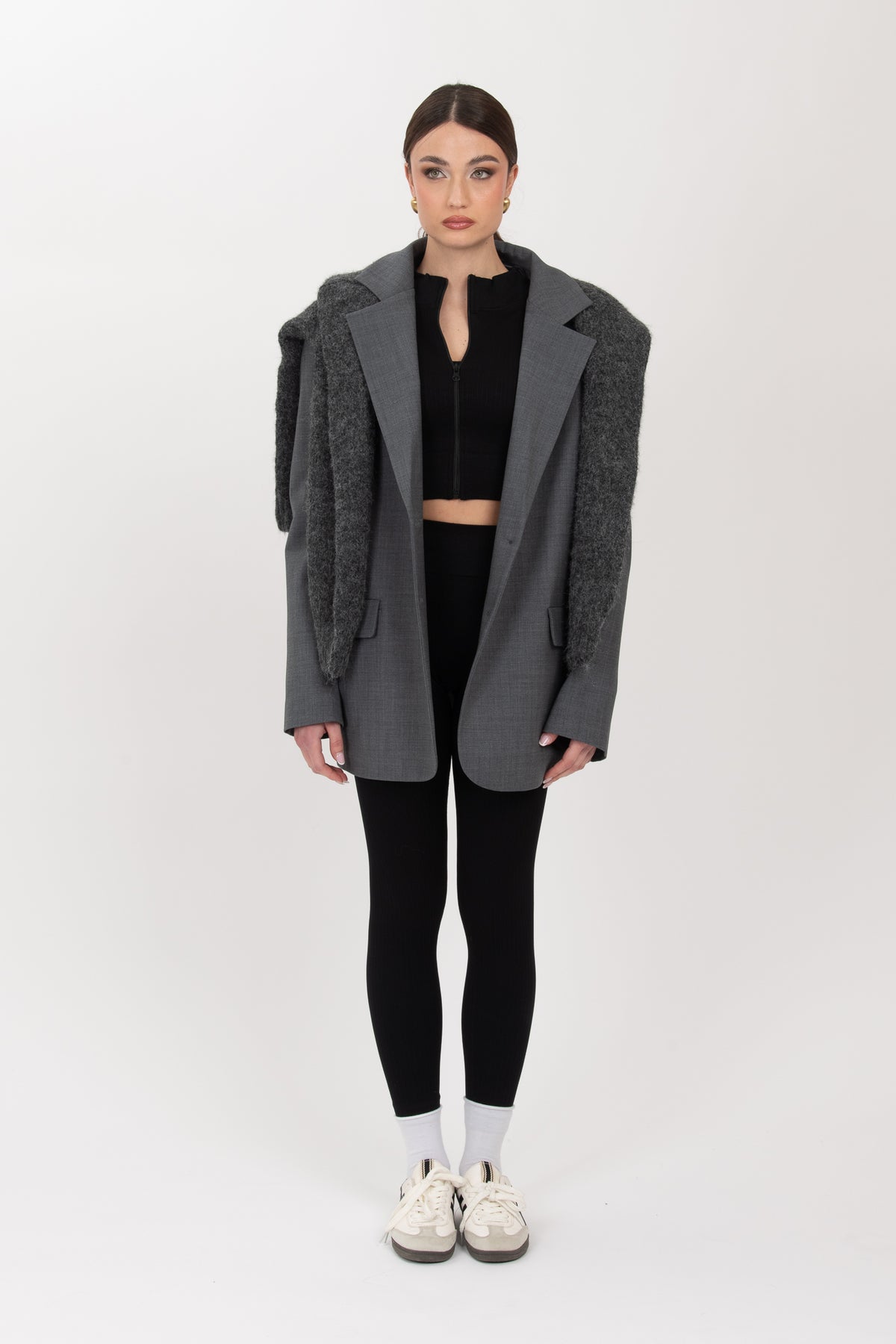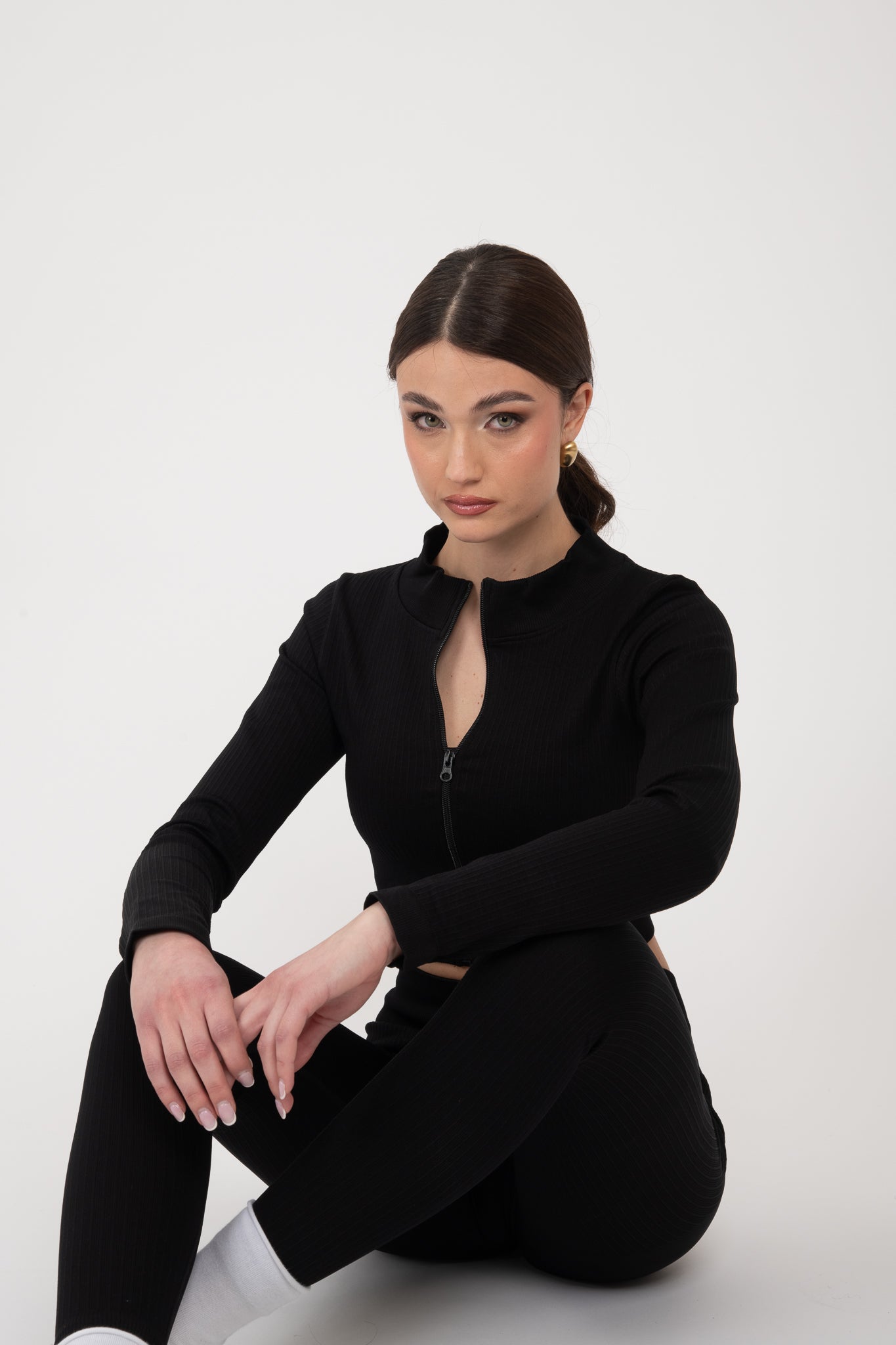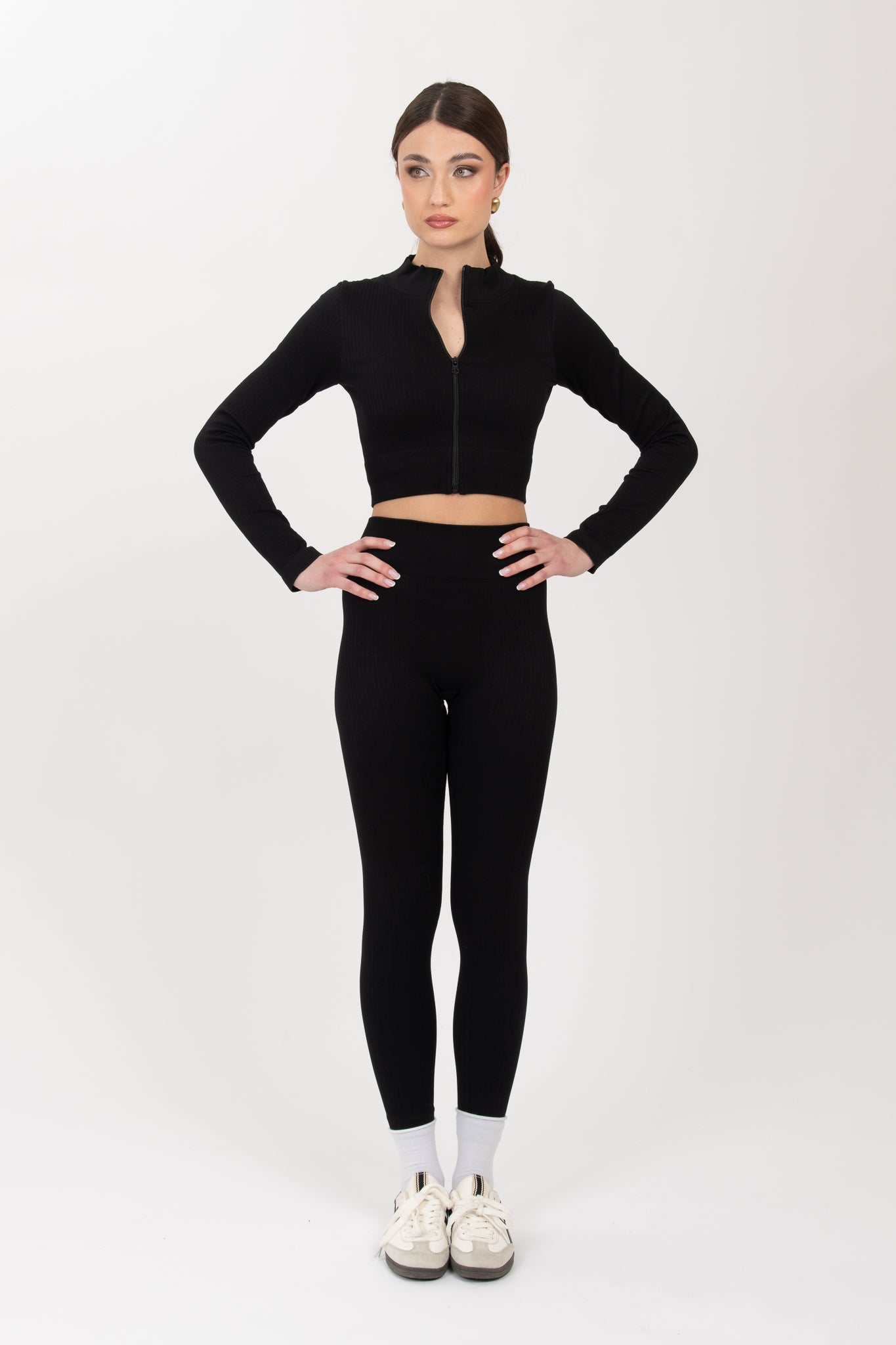 Coordinato sportivo composto da top crop elasticizzato con coppe interne, leggings vita alta elasticizzato e cardigan con zip effetto avvisato leggermente crop totalmente elasticizzato.