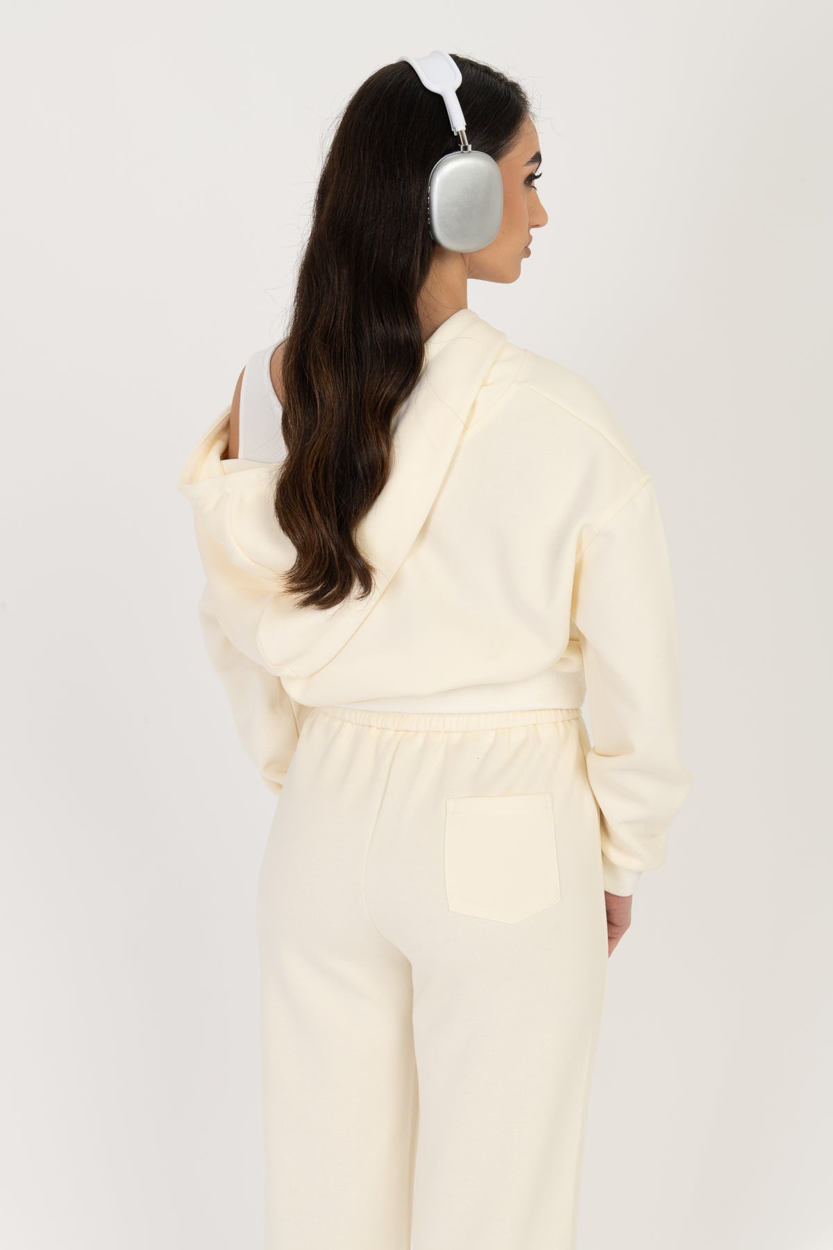 Coordinato tuta taglia unica composto da Felpa lunghezza leggermente crop, non felpata internamente, tasche sul davanti, internamente non foderata e finta canotta interna, cappuccio e zip sul davanti.