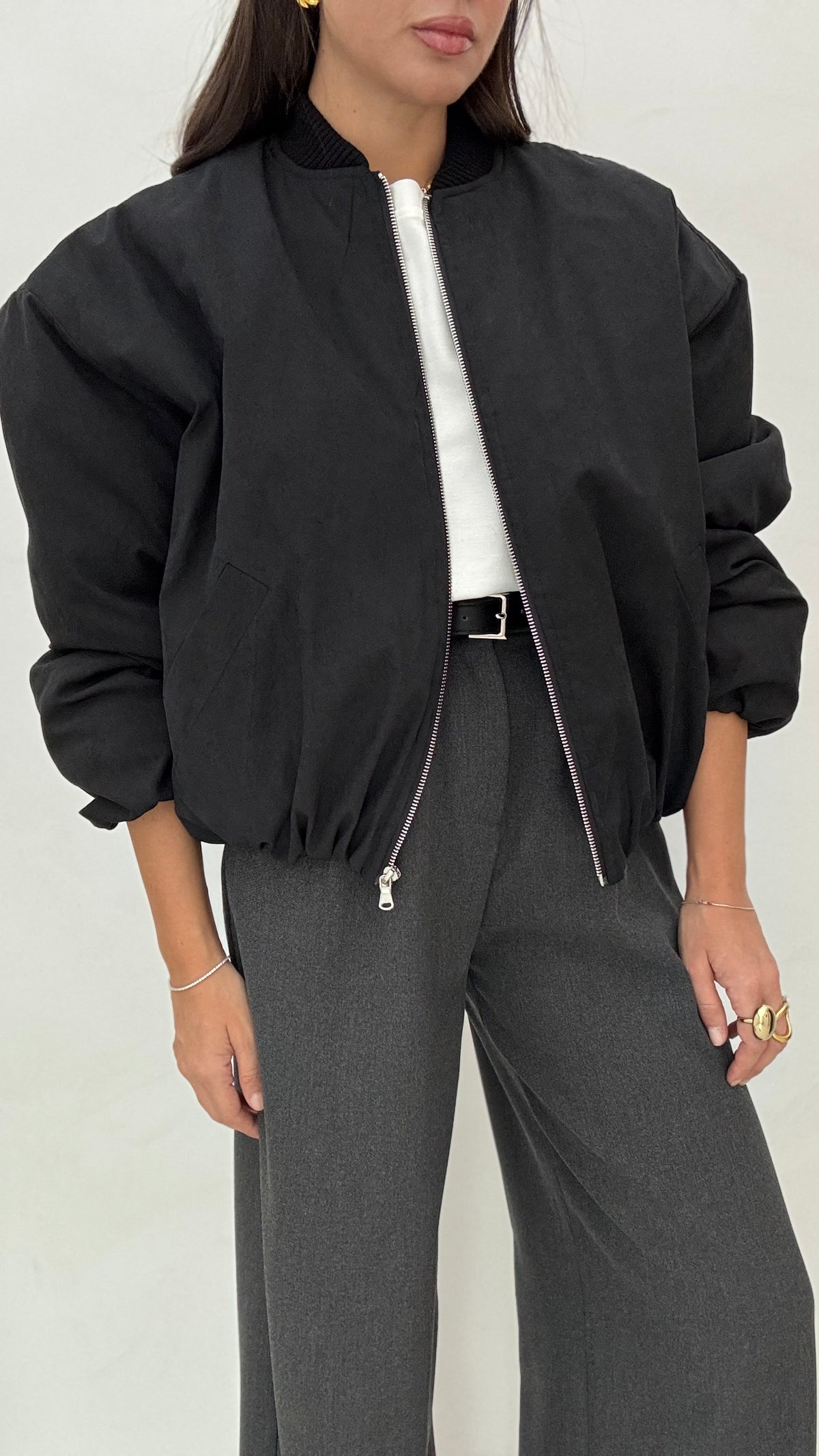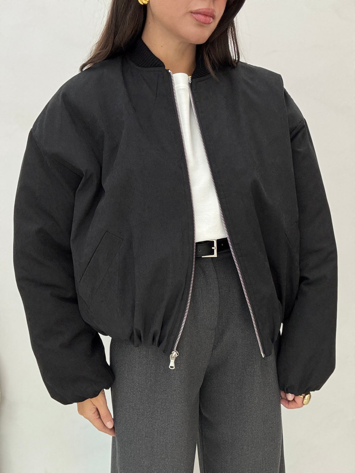 Robi è alta 1.63, solitamente indossa taglia XS, il bomber è taglia unica, vestibilità oversize, tasche vere, chiusura con zip, foderato internamente, veste fino a taglia L/XL.