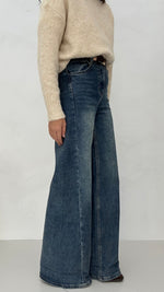 Jeans elasticizzato,piegone non cucito, gamba larga e svasata, veste regolarmente.